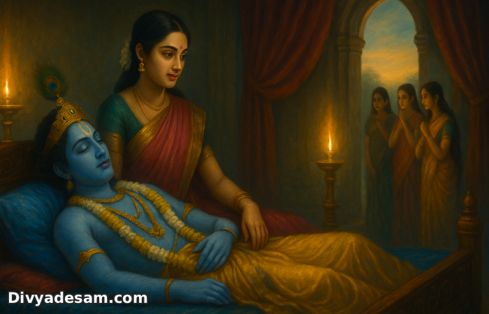 Methendra Panjasayam : On the silky bed, Sri Krishnar gives his sayakolam. |