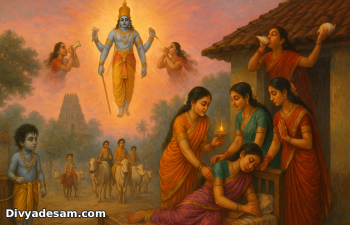 "Hey Paavais! Mayan and Vallavan Sri Krishnan who took his Avatharam in Mathura has played through the shores of Yamuna river has given the greatness and bhaghyam for his mother Yasodhai and the entire Aayar kulam. He has also got the other thiru Naamam - Dhamodharan. We should worship him with great bhakti and should dedicate lots of flowers towards his Thiruvadi and should praise him. By chanting his great Naamam and worship, our sins get vanished and what are problems we are going to face will all reduce. And this placed in fire. So, chant his Thiru Naamam and get his blessings."