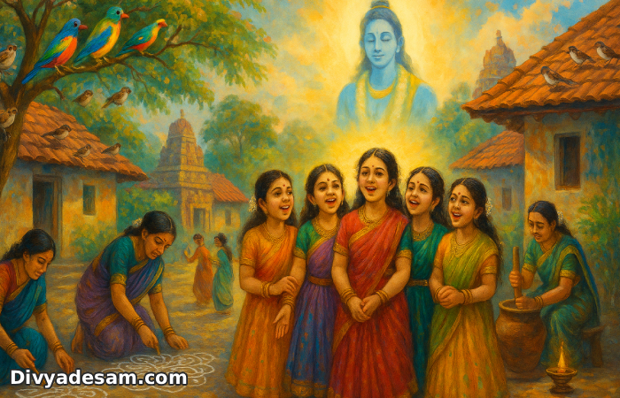 "Paavai! The birds are seen together and they have started to raise the sound (means the wake up time has come). The sweet exchange of words of the birds are so sweet and these sound didn't heard by you? In spite of the day started, you are still sleeping? The crunching sound of the buttermilk by the Aayar Kula women didn't heard by you. Sri Krishnar who is found in the heart and outside got the thiru Naamam as "Kesavan" by killing the Asuran - Kesi who is sent by Kamsan. Instead of praising his greatness during this great margazhi month, you all are sleeping. Come, wake up now!"