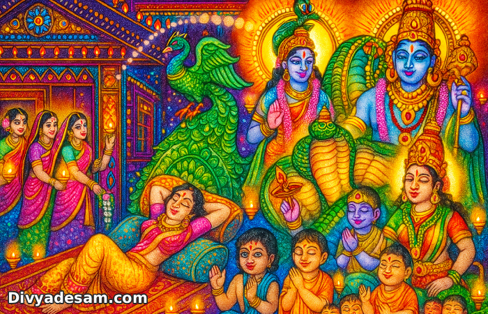 Manikkadhavum Thaalthiravai : Sri Andal is waiting outside the house calling her cousin. Inspite of calling her for a long time, she asks her to open the close door. |